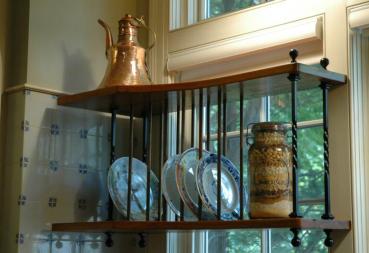 custom plate rack in teak and grooved with black wrought iron spindles and finials
